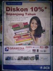 Pemberian diskon berlaku disemua outlet Gramedia dan Trimedia yang sudah menerima flazz. Penawaran ini berlaku panjang yaitu hingga 31 Januari 2012. Anda pemilik creditcard BCA dan hobi koleksi buku?Maka manfaatkan kesempatan ini.