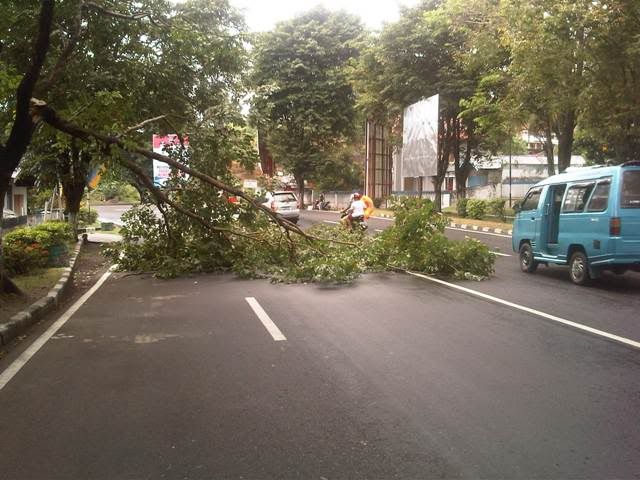 Dahan pohon patah akibat diterjang angin tepat didepan Gudang Bulog.