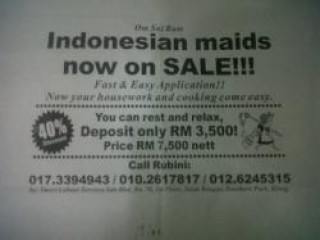 "Indonesian maids now on Sale. Fast and Easy application. Now your housework and cooking come easy. You can rest and relax. Deposit only RM 3,500 price RM 7,500 nett" tulis iklan itu.