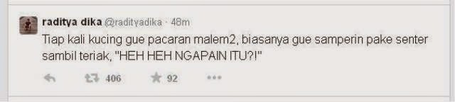 "Tiap kali kucing gue pacaran malem2, biasanya gue samperin pake senter sambil teriak, HEH HEH NGAPAIN ITU?!" Tulis Raditya.