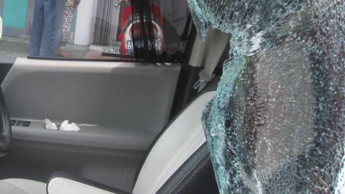 Kaca mobil AVP pelat merah DB 1217 GM itu pecah, bagian bodi belakang penyok, dan sisi samping sengaja digores.