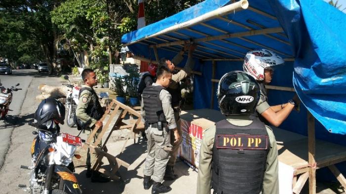 Sat Pol PP Kotamobagu menertibkan lapak pedagang kembang api dan petasan di trotoar pinggir jalan Kelurahan Mogolaing Senin (14/12/2015).