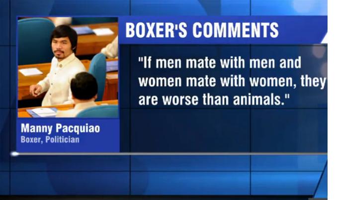 "Pacquiao ... mengkhianati pemahaman yang dangkal terhadap orientasi seksual dan identitas gender, bahkan dasar-dasar ilmu pengetahuan, " katanya dalam sebuah posting di halaman Facebook -nya. (CNN)
