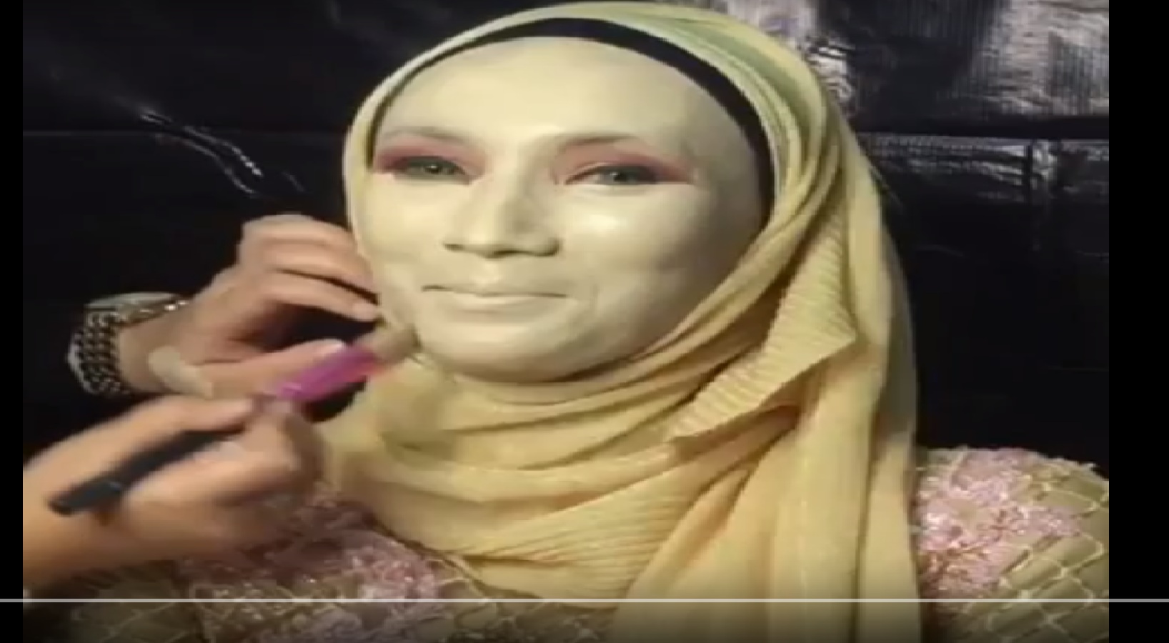 Setelah foundation diratakan ke wajah model tersebut, wajahnya justru terlihat kuning senada dengan jilbabnya.
