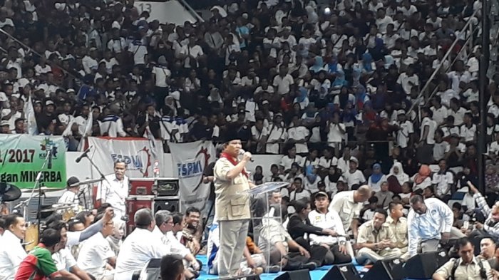 TRIBUNMANADO.CO.ID, JAKARTA - Peringatan Hari Buruh Internasional, 1 Mei 2018, di Istora Senayan, Jakarta, berubah menjadi ajang politik menjelang Pemilihan Presiden 2019. Ketua Umum Partai Gerindra, Prabowo Subianto, yang bakal maju dalam Pemilihan Presiden (Pilpres) 2019, mengaku merinding melihat ribuan massa buruh yang hadir.