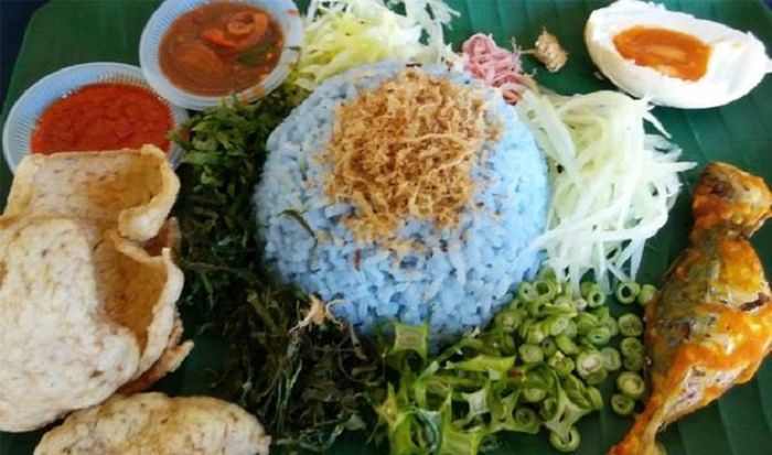 Makanan khas dari Kelantan ini menggunakan bunga telang sebagai pewarna alami untuk nasi yang akan dimasak.