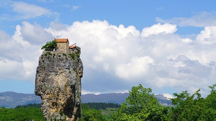 Semantara itu, ada gereja Tritunggal Mahakudus bertengger tinggi di atas dari batu di Meteora di Yunani tengah.