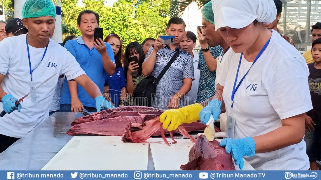 Amatan Tribunmanado.co.id, para tamu begitu antusias menyaksikan demo pemotongan tuna.