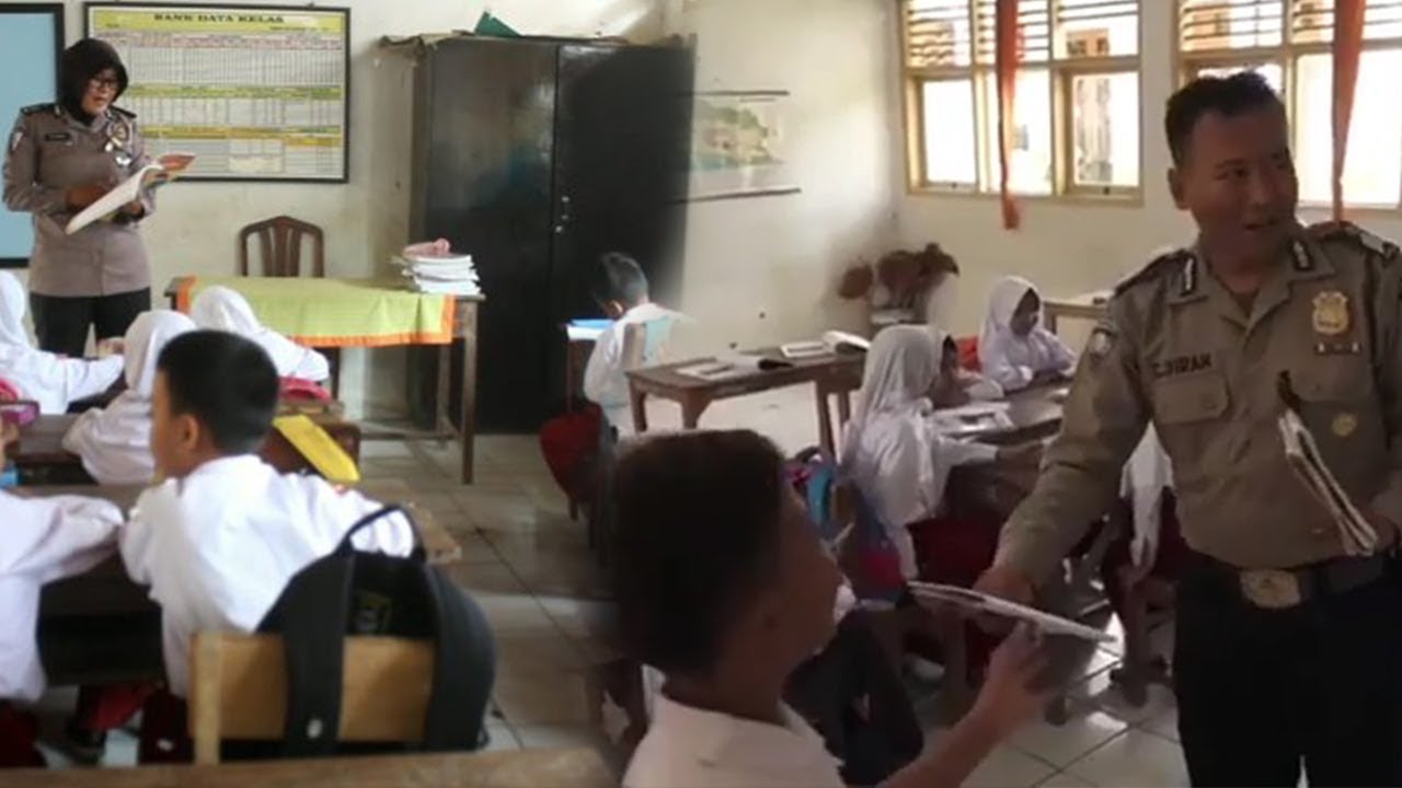Anggota polisi ini menjadi guru dadakan yang mengajar kelas 1, 3, dan 6 di SD Negeri 1 dan 2 Krasak, Indramayu, Jawa Barat.