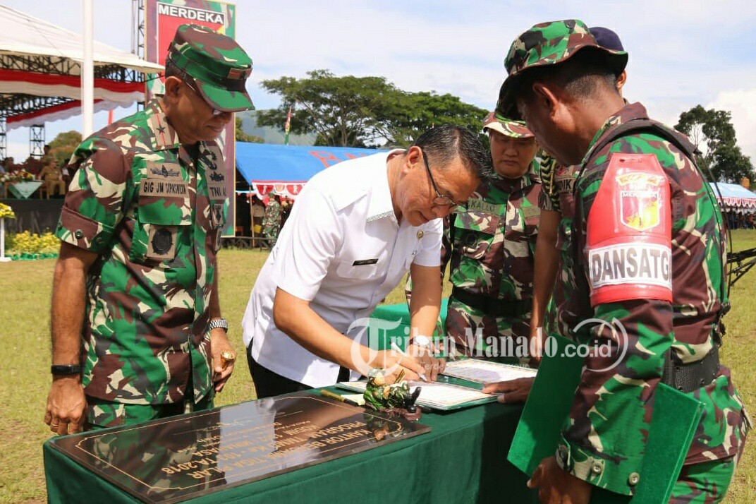 Wali Kota Tomohon Jimmy Feidie Eman,bersama dengan Komandan Lantamal VIII Laksamana Pertama TNI Gig Jonias Mozes Sipasulta menandatangani naskah berita acara penyerahan hasil kegiatan TNI Manunggal Membangun Desa ke- 103 tahun 2018.