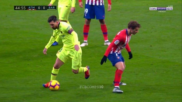 Ada satu momen ketika Antoine Griezman mencoba menahan laju Lionel Messi yang menggiring bola.