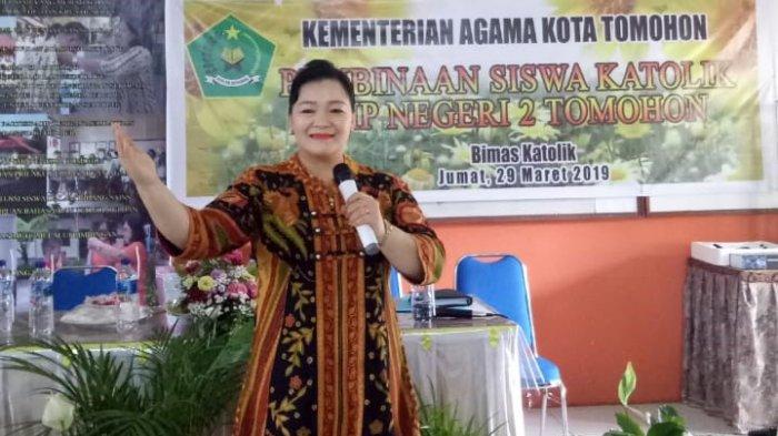 TRIBUNMANADO.CO.ID, TOMOHON - Penyuluh Agama Katolik Videllia E Pontoh SS memberikan materi dalam pembinaan siswa Katolik SMP Negeri 2 Tomohon, Sulawesi Utara, oleh Bimas Katolik Kementerian Agama Tomohon, Jumat (29/03/2019).