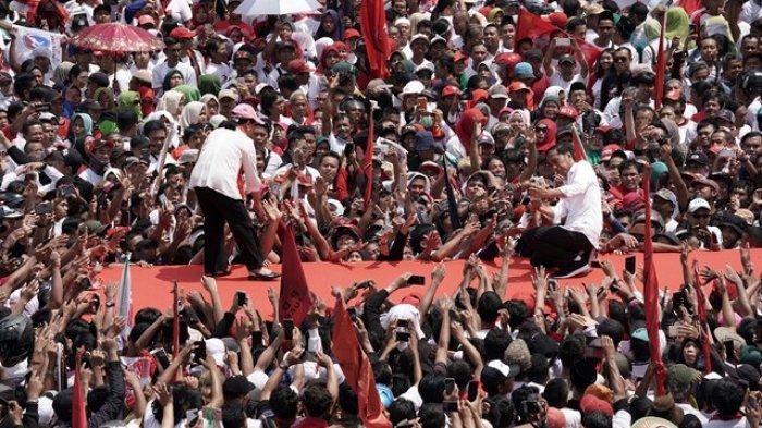 TRIBUNMANADO.CO.ID, BANYUMAS - Calon presiden nomor urut 01 Joko Widodo beserta Iriana, istrinya, menaiki mobil jip terbuka, saat akan berkampanye di GOR Satria, Purwokerto, Kabupaten Banyumas, Jawa Tengah Kamis (4/4). Masa yang menunggu sedari pagi tumpah ruah menyambut kedatangan Jokowi.