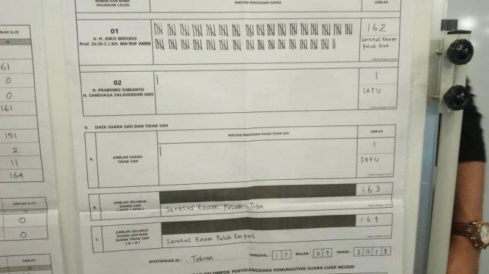 Dari hasil penghitungan PPLN Tehran Rabu (17/4) pukul11.30 waktu setempat atau 14.00 WIB, pasangan calon Joko Widodo-Ma'ruf Amin meraih suara terbanyak 230 suara (90,90 %).