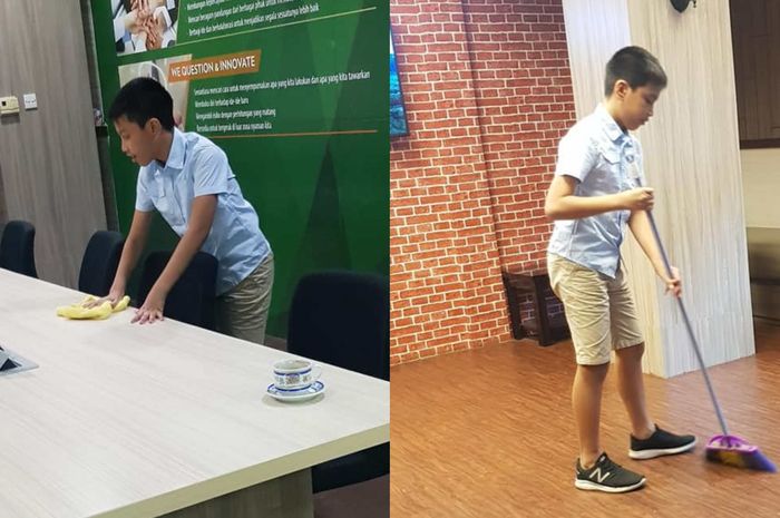 Dalam Facebook-nya, Taufiq Tyo Ramadhantyo mengunggah momen sang anak saat bersih-bersih di kantornya.