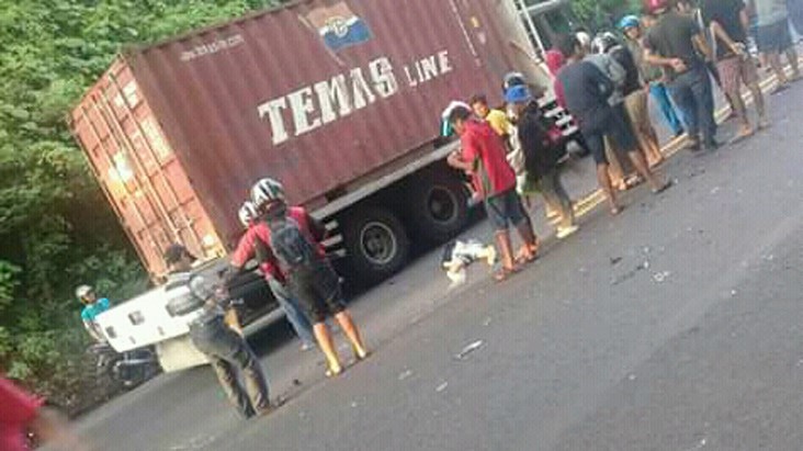 Kecelakaan antara sepeda motor Suzuki Satria FU DB 5005 AJ yang dikendarai oleh Calvin Patrick Warokka (22), Mahasiswa, Warga Desa Lemoh Barat, Kecamatan Tombariri Timur, Kabupaten Minahasa kontra Kendaraan Truk DB 8016 FY yang dikemudikan oleh Ruben Ruru (46), warga Desa Wawontulap Jaga I Kecamatan Tatapaan Kabupaten Minsel dan Kendaraan Toyota Kijang DB 1239 AQ yang dikemudikan oleh Stevi Kewo (37), warga, Singkil Satu, Manado.