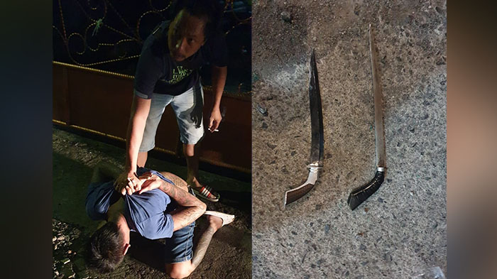 Tersangka saat dirangkap Polisi dan dua buah bukti senjata tajam milik tersangka.