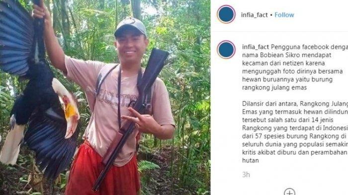 Sebuah foto viral memperlihatkan laki-laki berfoto dengan latar belakang hutan sambil membentangkan burung rangkong yang telah mati