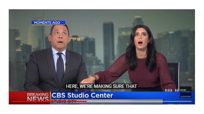 Di Los Angeles, presenter berita berita Juan Fernandez dan Sara Donchey berada di stasiun CBS menyiarkan secara langsung ketika gempa Jumat mengguncang.