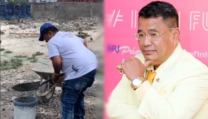 Dengan sekop di tangannya, Hotman Paris tampak serius memindahkan kerikil sedikit demi sedikit ke dalam sebuah ember bak kuli bangunan.