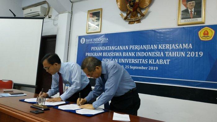 Kepala Perwakilan BI Sulut, Arbonas Hutabarat MBA dan Rektor Unklab, Dr Marten Sengkey SE MBA menandatangani perjanjian kerja sama pemberian Beasiswa BI di Ruang Conference Unklab, Rabu (25/09/2019).