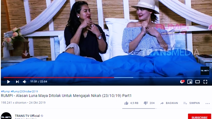 Tapi untuk saat ini enggak," ujar Luna Maya dikutip TribunStyle dari kanal YouTube Trans TV Official 'Rumpi- Luna Maya Mengukapkan Isi Hatinya Yang Sudah Terpendam'.