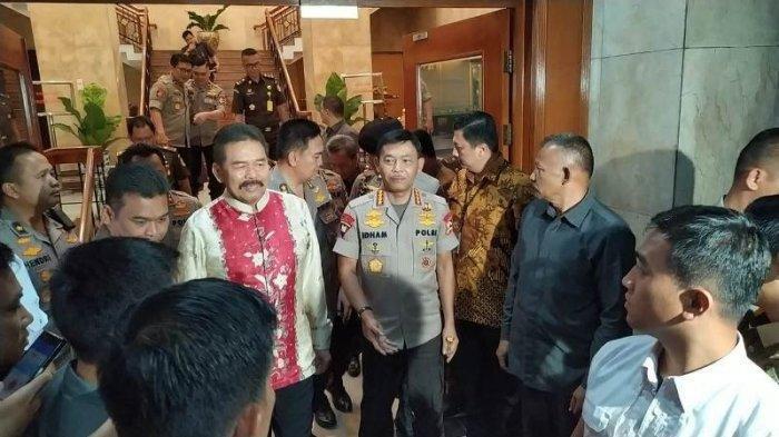 Usai melakukan pertemuan tertutup, Idham Aziz tampak keluar bersama Jaksa Agung Burhanudin ST ditemani jajaran petinggi masing-masing institusi.