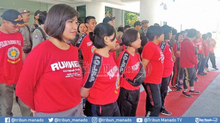 Ditempatkan para personel Pol PP wanita di barisan terdepan persis di depan lobi Kantor Gubernur Sulut.