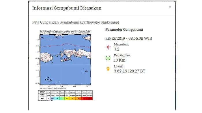 TRIBUNMANADO.CO.ID - Info terkini gempa bumi. Terjadi hari ini Sabtu 28 Desember 2019 tadi pagi. Lokasinya di Ambon.