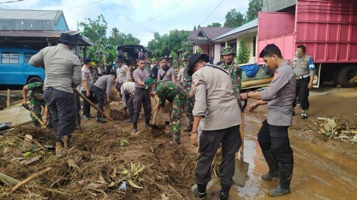 TRIBUNMANADO.CO.ID - Personel Polres Kepulauan Sangihe bersama anggota Brimob Polda Sulut, Sabhara Polda Sulut dan Dit Polairud, serta TNI, hingga Senin (6/1/2020) tadi, terus melakukan pembersihan sisa-sisa bencana banjir bandang dan tanah longsor di Kampung Lebo, Kecamatan Manganitu, Kabupaten Kepulauan Sangihe, Sulawesi Utara.