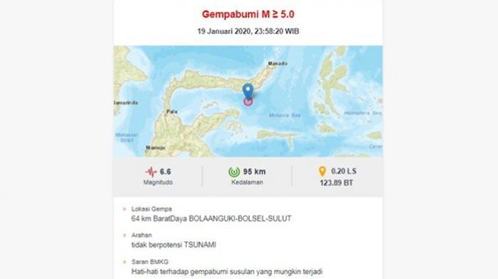 Tercatat oleh BMKG, gempa bumi tersebut terjadi di Sulawesi Utara (Sulut). Lokasi tepatnya yakni di di laut 64 km Barat Daya dari Bolaang Uki Kabupaten Bolaang Mongondow Selatan (Bolsel) SULUT.