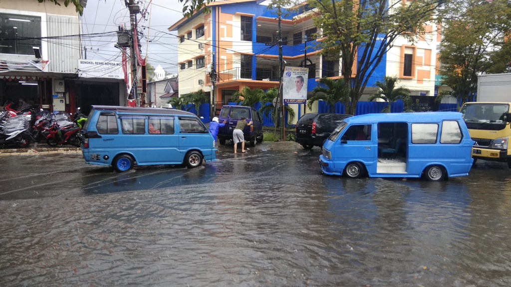 Hujan deras membuat banjir di depan SPBU Kecamatan Wenang, sehingga menganggu aktivitas warga
