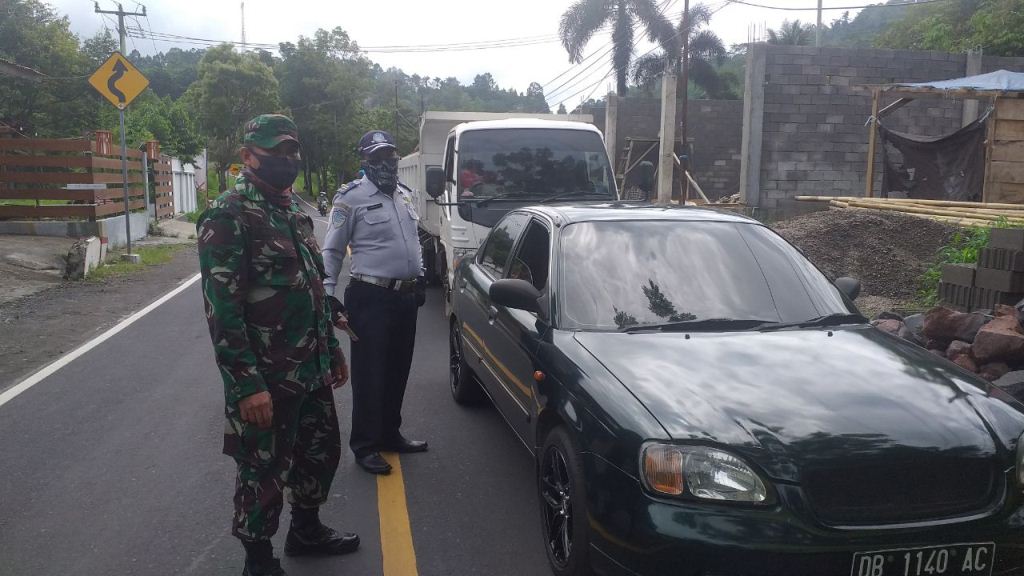 TRIBUNMANADO.CO.ID, TONDANO - Personel Komando Rayon Militer (Koramil) 1302-10/Sonder di bawah pimpinan Danramil Pelda F Mathindas, berkontribusi dalam Pos Pemeriksaan dan Pembatasan Akses Keluar Masuk Kota Tomohon-Kabupaten Minahasa, tergabung dalam Gugus Tugas Percepatan Pencegahan Virus Corona Kabupaten Minahasa, Rabu (29/4/2020).