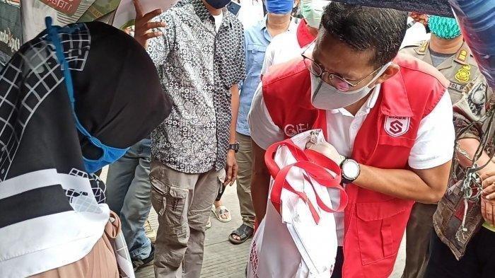 Secara simbolis, Sandiaga membagikan 20 paket sembako kepada para buruh korban pemutusan