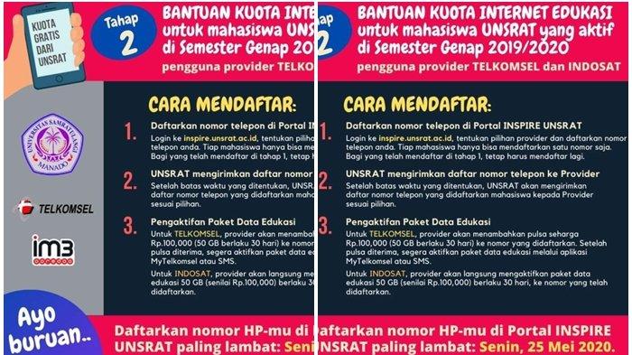 "Kuota gratis dari Unsrat tahap 2 bantuan kuota internet edukasi untuk mahasiswa Unsrat yang aktif di semester genap 2019/2020 yakni untuk pengguna provider Telkomsel dan Indosat," jelasnya.