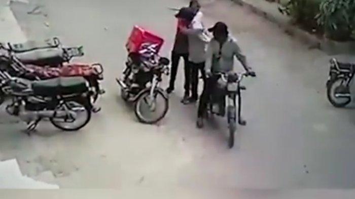 Dua orang pencuri yang mengendarai sepeda motor mengembalikan barang yang dicuri dari pria pengantar makanan.