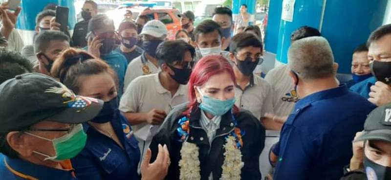 Vonnie Anneke Panambunan STh tiba di bandara Sam Ratulangi Manado, disambut oleh para pendukungnya, Selasa (30/6/2020)