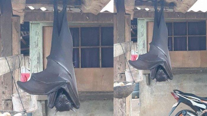 Tampak dalam gambar, hewan kelelawar bertubuh hitam "seukuran manusia" bergelantung di atas kabel rumah warga.