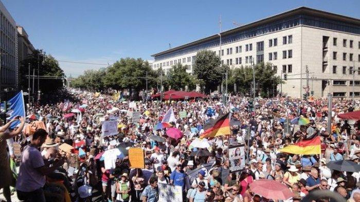 TRIBUNMANADO.CO.ID - Jalanan Kota Berlin pada Sabtu (1/8/2020) riuh dengan kehadiran ribuan orang.