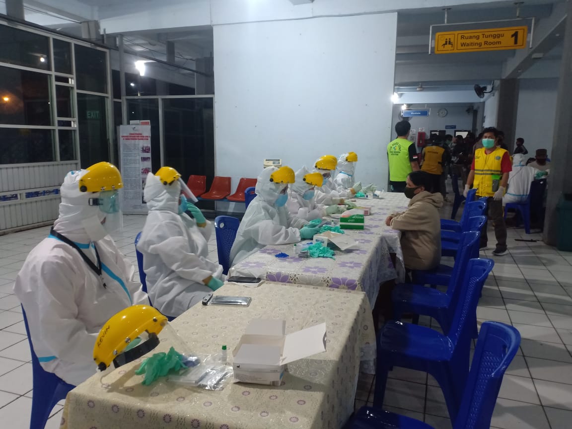 640 Penumpang KM Sinabung yang turun di Pelabuhan Samudera Bitung menjalani tes cepat atau rapid test Covid 19 di dalam terminal, Rabu dini hari