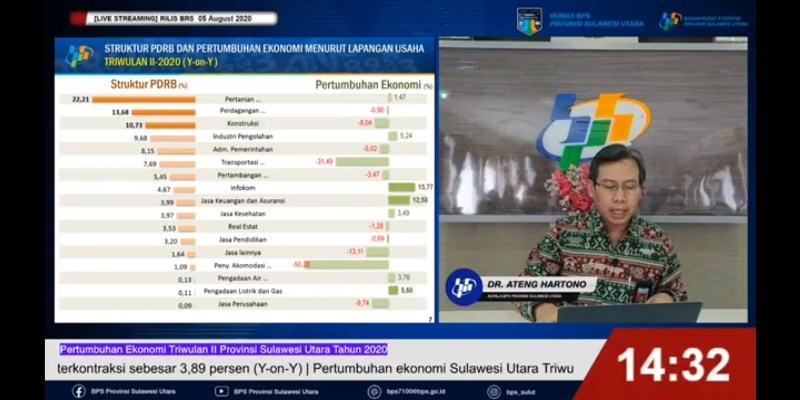Pertumbuhan Ekonomi Sulut di triwulan II tahun 2020 terkontraksi 3,89 persen dibanding triwulan II tahun lalu