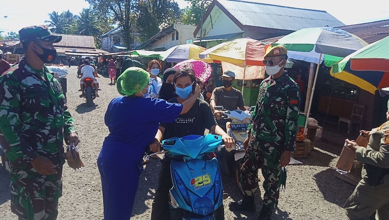 Sembari memberi peringatan, tim membagikan masker kepada pengunjung pasar.