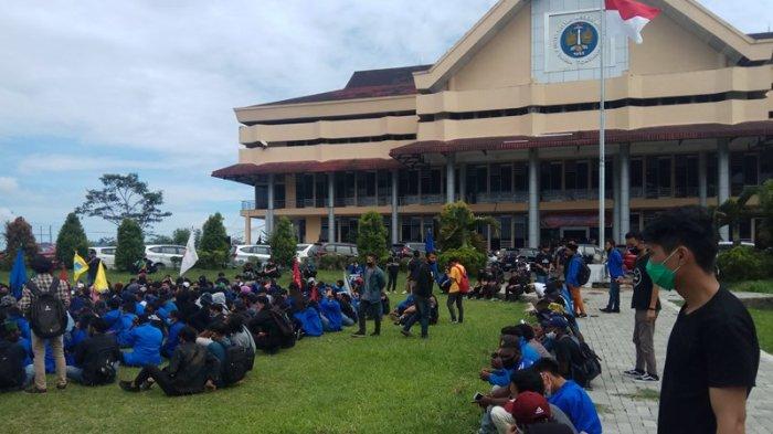 TRIBUNMANADO.CO.ID, TONDANO - Ratusan Mahasiswa Universitas Negeri Manado menggelar aksi protes atas pengesahan Rancangan Undang-Undang Cipta Kerja.