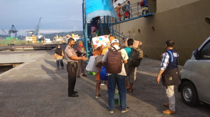 Tim gabungan yang terdiri dari Polsek KPS (Kawasan Pelabuhan Samudera), TNI, PT Pelni, PT Pelindo IV, serta Dinas Karantina terus melakukan pengamanan sekaligus penerapan protokol kesehatan saat embarkasi penumpang KM Tatamailau yang akan menuju Tidore, Maluku Utara, Rabu (14/10/2020).