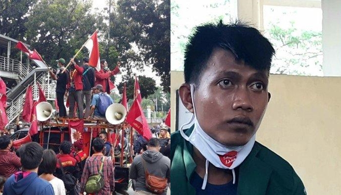 Aksi unjuk rasa menolak Undang-Undang Cipta Kerja dimanfaatkan celah Tris Hariyanto untuk mencopet demonstran mahasiswa, di dekat IRTI Monas, Jalan Medan Merdeka Selatan, Jakarta Pusat, Rabu (28/10/2020) siang.