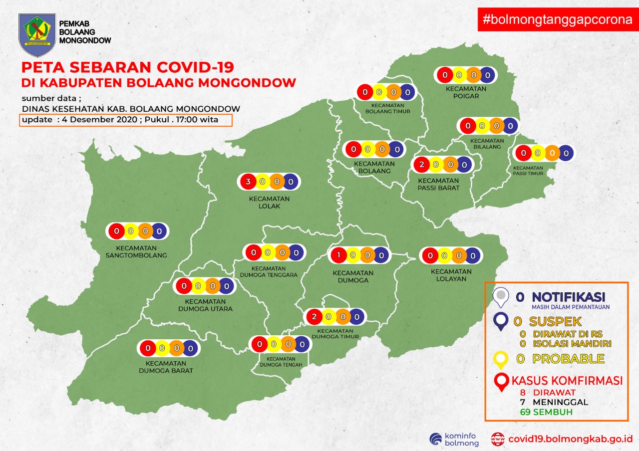 Kasus Covid 19 di Kabupaten Bolmong melonjak jelang Pilgub 2020. Hingga Sabtu 5 Desember 2020, terdapat 97 kasus.