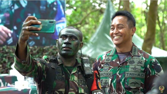 TRIBUNMANADO.CO.ID - Seorang prajurit TNI meminta foto selfie dengan KSAD Jenderal Andika Perkasa usai melaksanakan latihan. Prajurit ini merasa senang bisa berjumpa dengan pemimpin mereka.