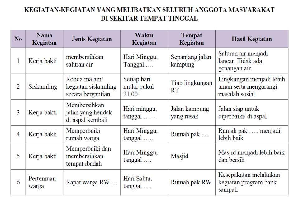 Dengan bantuan anggota keluargamu, catatlah kegiatan-kegiatan yang melibatkan seluruh anggota masyarakat di sekitar tempat tinggalmu. Masukkan hasil pengamatanmu pada tabel di bawah ini.