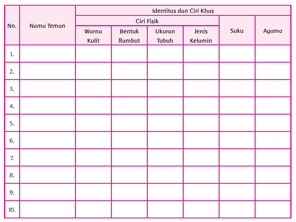 1. Ayo, amati berbagai keberagaman yang ada di kelasmu. Tuliskan pada tabel berikut.