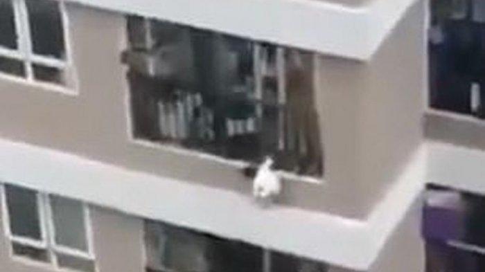 Video memperlihatkan seorang anak mengenakan pakaian berwarna putih di pagar balkon membuat histeris banyak orang yang berada di kawasan apartemen.